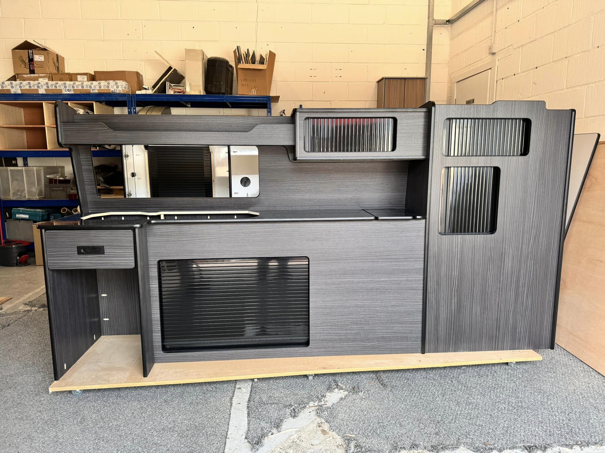 This style of Camper Kitchen for VW T5 T6 LWB is slightly different from our standard style and features an extra cupboard with tambour roller door on top of the worktop, meaning even more storage space.