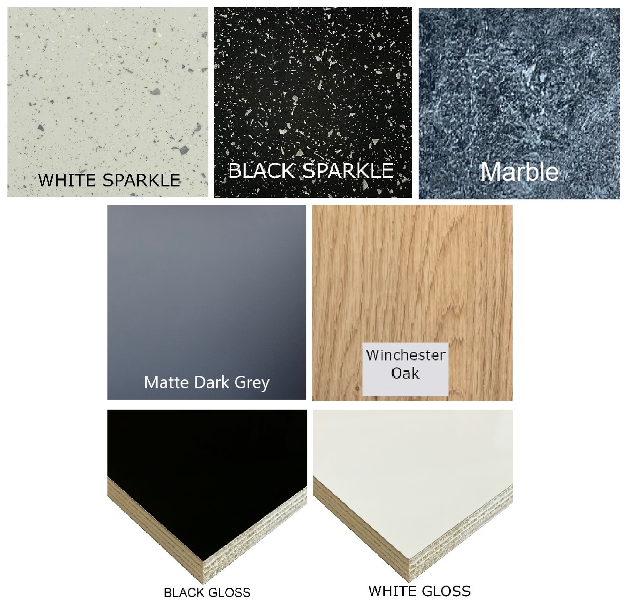 Dark Grey Matte, Gloss Black, Gloss White, White Sparkle (smooth, glossy), Black Sparkle (smooth, glossy), Winchester Oak Effect (smooth, matt), Marble (textured, matt)